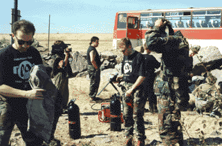 Что бы там не говорилось, каждый из нас хочет быть героем. Если не Александром Матросовым или там Рембой, то хотя бы Васьком Трубачевым. Иначе как еще объяснить, что взрослые и вполне вменяемые люди в собственный выходной вместо того, чтобы лежать на солнышке, тащатся в Питер и волокут с собой немеряный объем оборудования только для того, чтобы перемазать друг друга краской. Так вот и мы собрались в Питер. Сцена погрузки была достойна сама по себе: объем нашего багажа легко превращал скорый поезд Москва-Питер в товарняк. Особенно хорошо сочетались аквалангические баллоны и компрессор с двумя пятидесятилитровыми бочками пива. Прибыли рано поутру, перетащили скарб через площадь в "Октябрьскую" и выкатились на улицу дожидаться автобуса. Дождались. Поехали. Ехали довольно долго - часа полтора по шоссе вдоль Финского залива, через Петродворец и Ораниенбаум. Потом цивилизация кончилась и началась разруха - промзона и марсианский пейзаж, оставшийся от строителей Дамбы. Дорог там как-то не было, были направления и наш Икарус, урча как тяжелый танк, поковылял через ухабы. Вскарабкались-таки на Дамбу, распугивая местных рыболовов, пейзан и агриколей, и добрались до ближней (метров 150) к форту №3 точки. ПОДГОТОВОЧКА Тут надо сказать, что Кронштадт, как порядочная морская крепость, был с моря прикрыт фортами и батареями, цепью отгородившими залив. В нонешние времена, когда на любом крейсере ракет хватит, чтобы любую столицу превратить в райский хутор, толку от фортов и батарей никакого, и их забросили. Некоторые из них саморазрушились, на некоторых тренировались подрывники, короче, осталась цепь развалин. Форт №3 на этом фоне - приятное исключение. Строили его серьезно, в лихую годину - во времена Крымской войны - дабы защитить Питер и Кронштадт от супостатов-англичан. Гранитные казематы, верхняя площадка для четырех тяжелых орудий (сейчас из них сделали причальные тумбы), две батареи калибром помельче и береговые доты производят весьма внушительное впечатление. За бесхозные годы все поросло травой по пояс и деревцами, окон, ясное дело, нет, но железные двери доживут еще до наших внуков.Первая партия погрузилась на плавсредство - довоенный, штучной работы адмиральский катер, переживший пятьдесят лет при советской власти. На остров ушли гарнизон (25 человека), судьи, зрители и журналисты (еще человек 30). Катер трюхал неспешно, томление нарастало. Полагаю, что тащить на остров зрителей было совершенно излишне - мало того, что в ходе высадки и боя они попадали в зону обстрела, так еще и некоторые успели накачаться крепкого пива до такого состояния, что им было все по фигу. Но вот катер вернулся и началась погрузка десанта - зрелище не для слабонервных. Грузились мы в катер "Гепард" на воздушной подушке и в три яла... Для лиц, незнакомых со шлюпочным делом, это было непростое испытание. Во-первых, в ялах было изрядно воды, во-вторых, мы долго путались, пытаясь сцепить катер и ялы в караван, в-третьих, десант мог кончится, не начавшись - мы чуть не поубивали друг друга при разборке весел и уключин. Надо сказать, что и мы сами оказались не на высоте - набились где пусто, где густо, так что в яле с четырьмя веслами шло 12 человек, а в шестивесельном - восемь, всего человек 35. Ялов получилось три - один с питерцами, коим было предписано высадиться на северном берегу и два с 